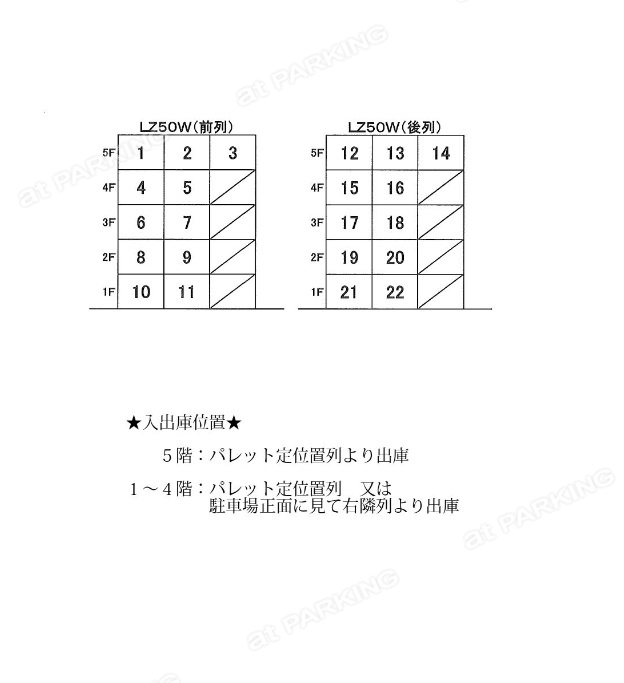| 駐車場スペック | 全高 1,550 ~ 2,100mm 全長 5,050mm 全幅 1,850mm 重量 2,000kg |
