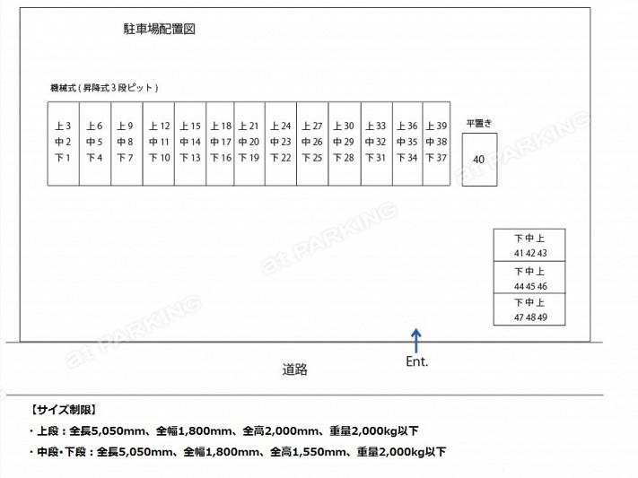 | 駐車場スペック | 全高 1,550 ~ 2,000mm 全長 5,050mm 全幅 1,800mm 重量 2,000kg |